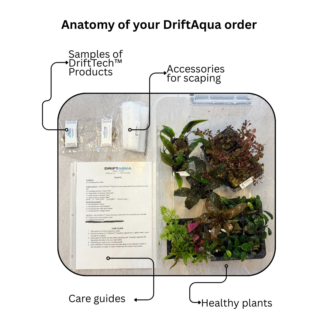 All orders receive a complimentary care pack, which may include a custom care guide, samples of DriftTech™ Transition to help your plants recover faster, samples of DriftTech™ Feed+Activate bioactive organic root tabs, and accessories such as plant weights.