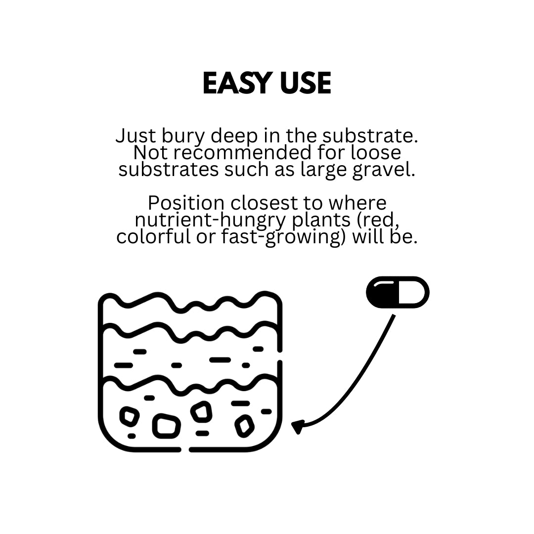 - Dosage: 1 capsule per ~1 sq ft of substrate. Example: a 5-gallon tank ≈ 1 sq ft of planted substrate.